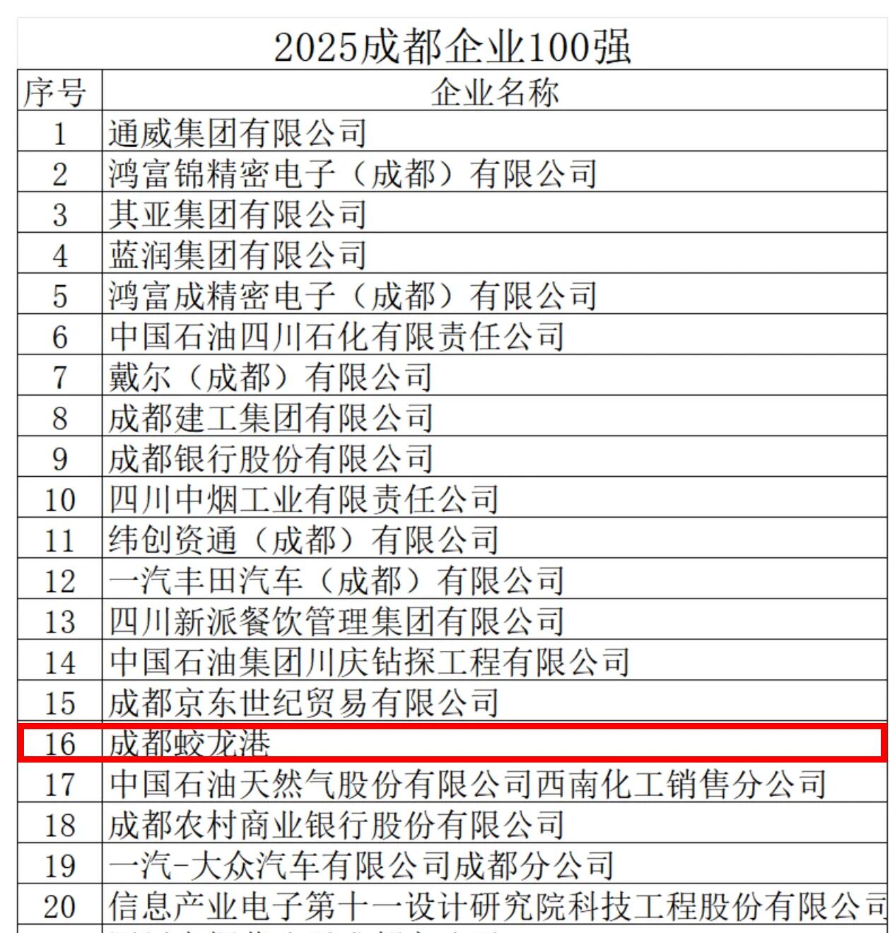 在“2025成都企业100强”榜单中,通威集团、鸿富锦精密电子(成都)、其亚集团、蓝润集团、成都蛟龙港等企业上榜。