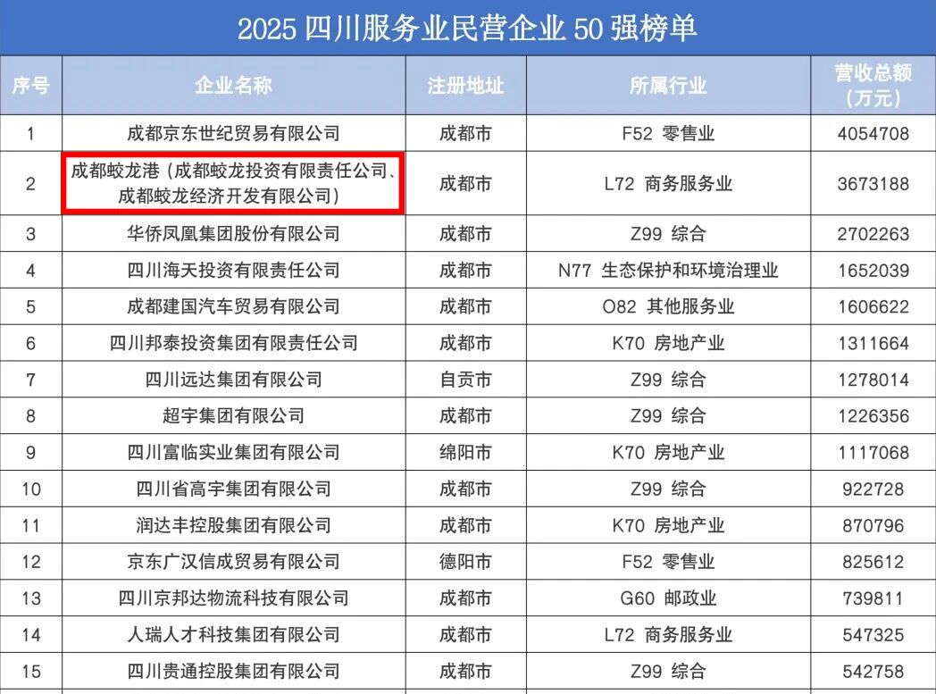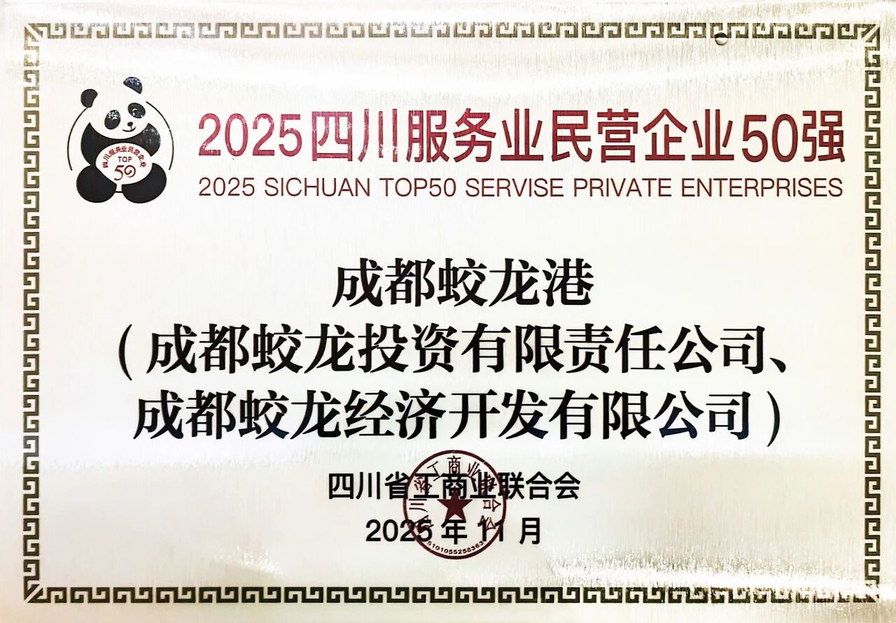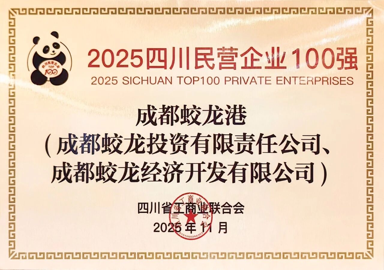 在“2025四川民营企业100强”榜单中,成都蛟龙港荣登第12名,同时荣获“2025四川服务业民营企业50强”前5强。